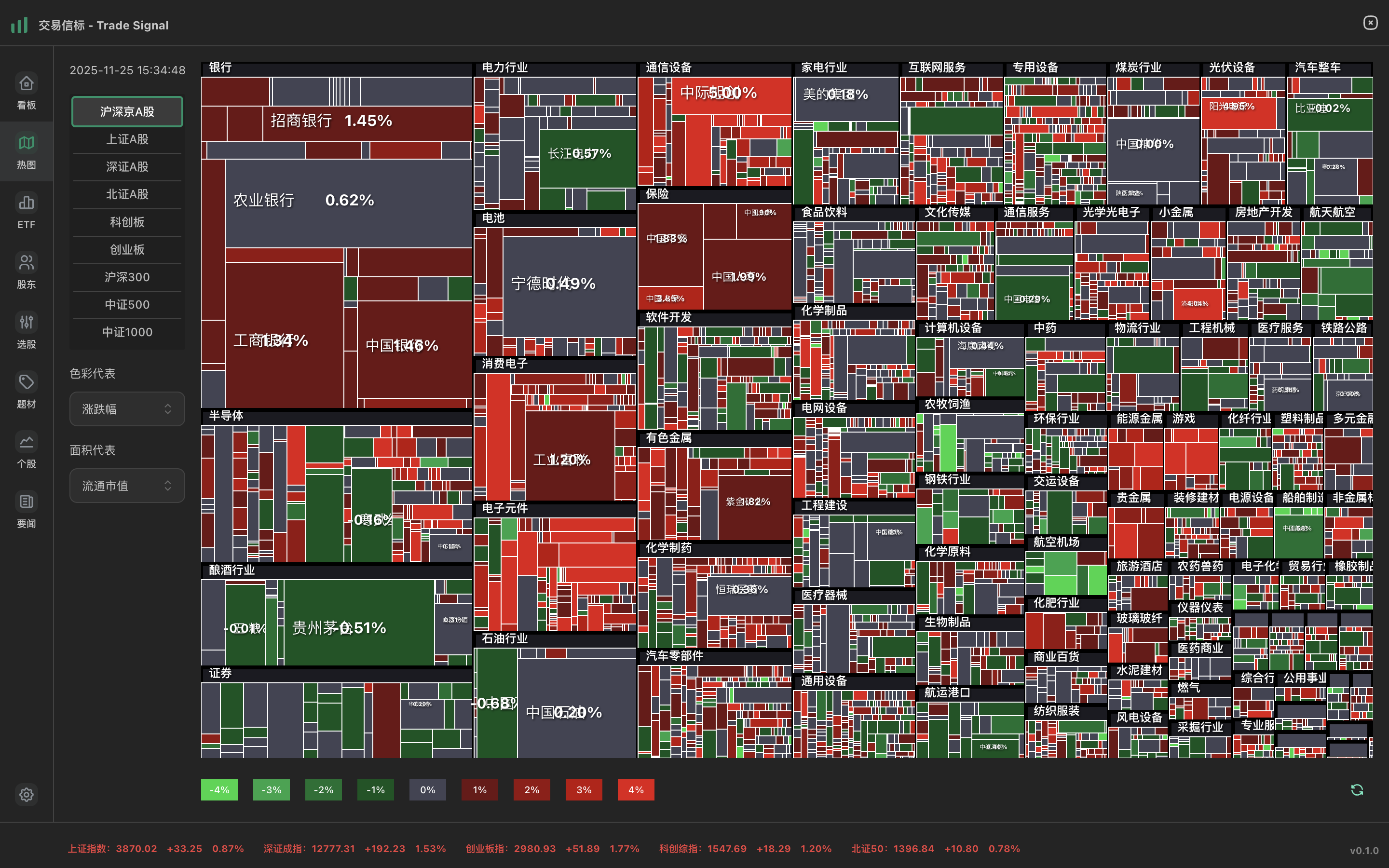 热图是热点追踪的重要工具,通过行业/概念板块热力图,帮助您快速发现异动板块和热点概念,是盘后复盘和热点追踪的核心功能